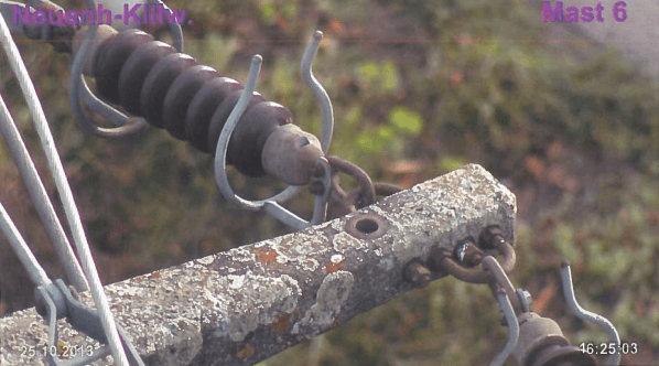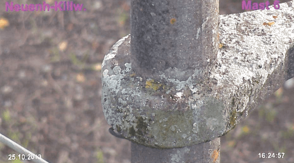 Die besonders exponierten Teile eines Betonmasts, nämlich die Ausleger, sind vom Boden aus überhaupt nicht zu kontrollieren. Stattdessen kommen Helikopter und hochauflösende Spezialkameras zum Einsatz. Auf ihren Bildern lassen sich selbst feinste Schäden erkennen. Zum Beispiel jene durch die Störche verursachten.