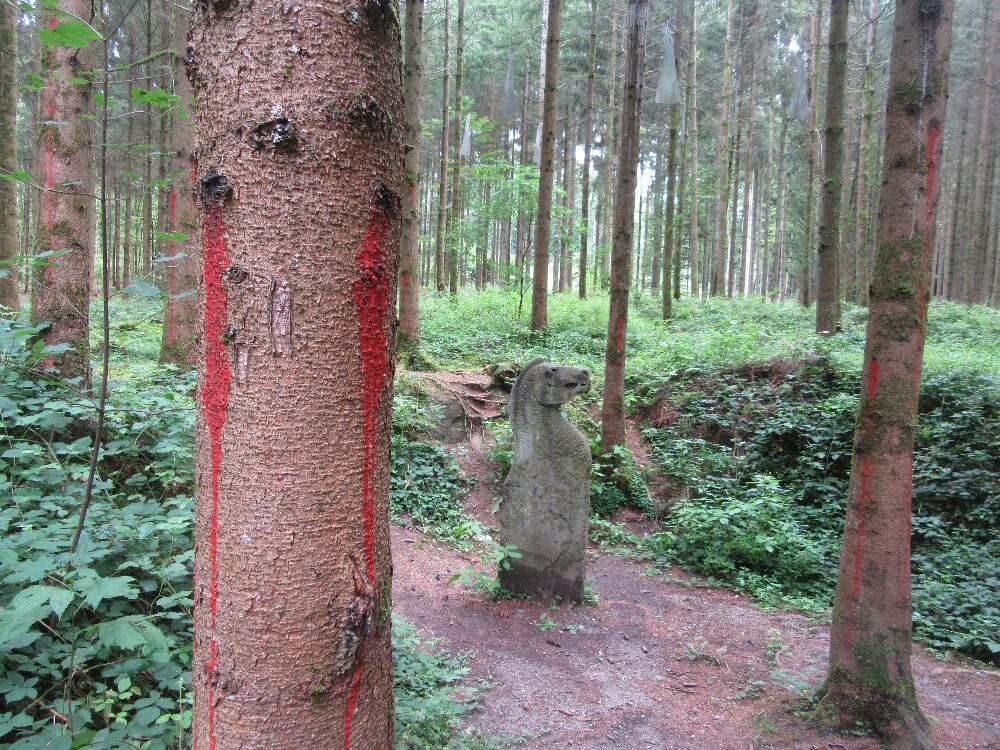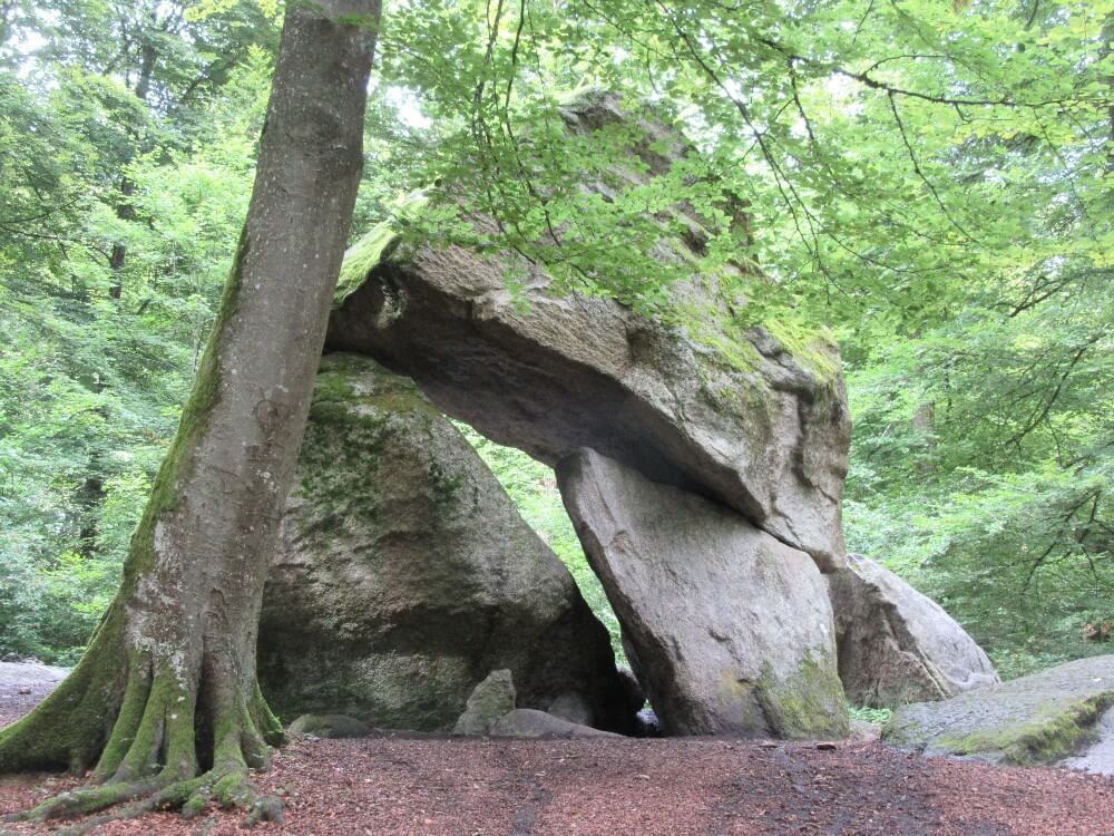 Dieses Waldgebiet birgt noch weitere Geheimnisse. Der Moränenhügel entstand vor vielen tausend Jahren, als diese Gegend von Gletschern bedeckt war. Die Eismassen transportierten jede Menge Gestein ins Tiefland, darunter gewaltige Felsbrocken. Überall ragen sie aus dem Waldboden. Einige dieser Findlinge sind beim Rückzug der Gletscher in merkwürdigen Formationen stehen geblieben. Da ist zum Beispiel der Bettlerstein: eine enorme Felsplatte steht schräg mitten im Wald, neben ihr noch weitere Gesteinsbuckel. In alten Zeiten haben Bettler hier ihr Nachtquartier aufgeschlagen, so wird erzählt.