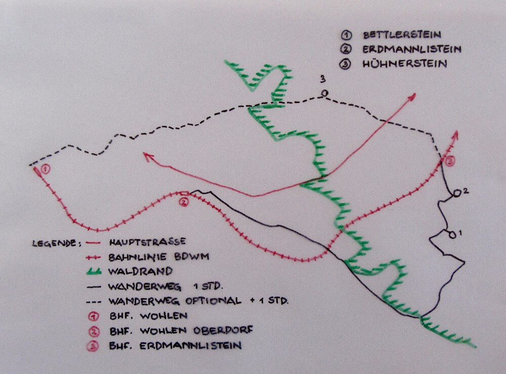 Die BDWM führt Sie in die Welt menschlicher Ängste und Abgründe, wie sie in Sagen zu finden sind. Dabei beginnt alles so harmlos und sanft. Sie besteigen in Wohlen den Zug und fahren eine Station weit, bis Wohlen Oberdorf (Halt auf Verlangen). Dem Wanderweg folgend, kommen Sie zur Oberen Haldenstrasse hinauf und wandern immer den gelben Markierungen nach aus der Ortschaft hinaus Richtung Wald. Sie befinden sich hier auf dem Freiämterweg mit den braunen Rhomben.