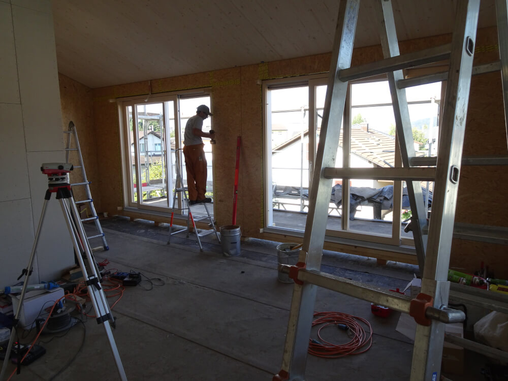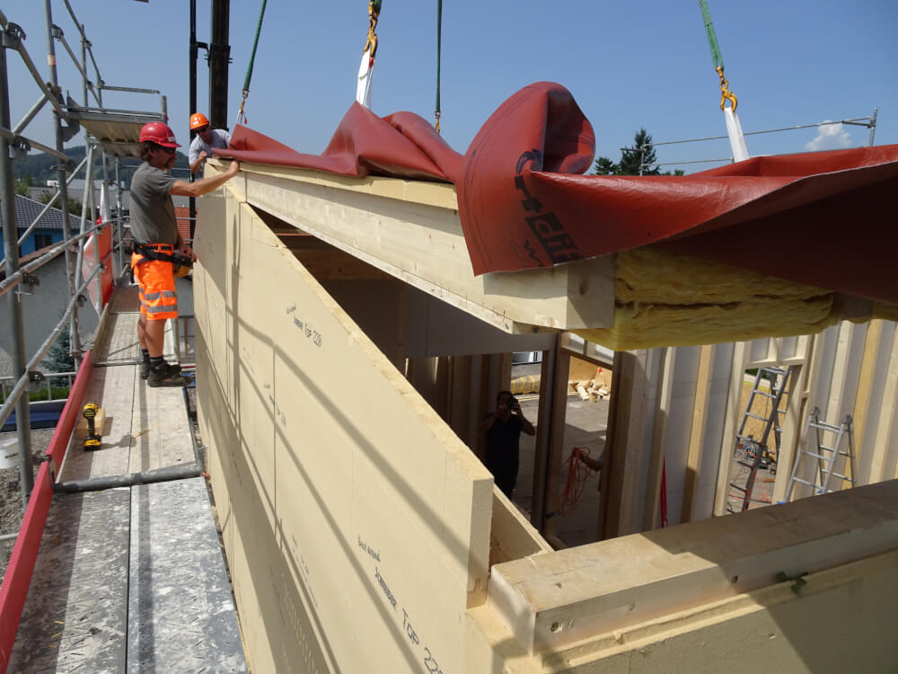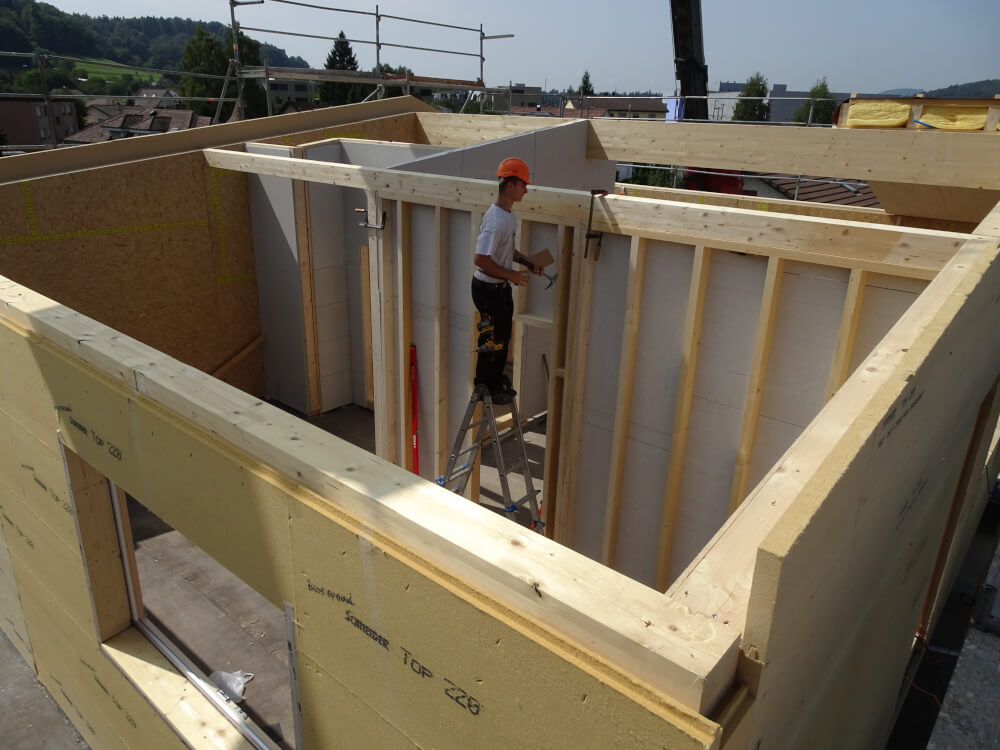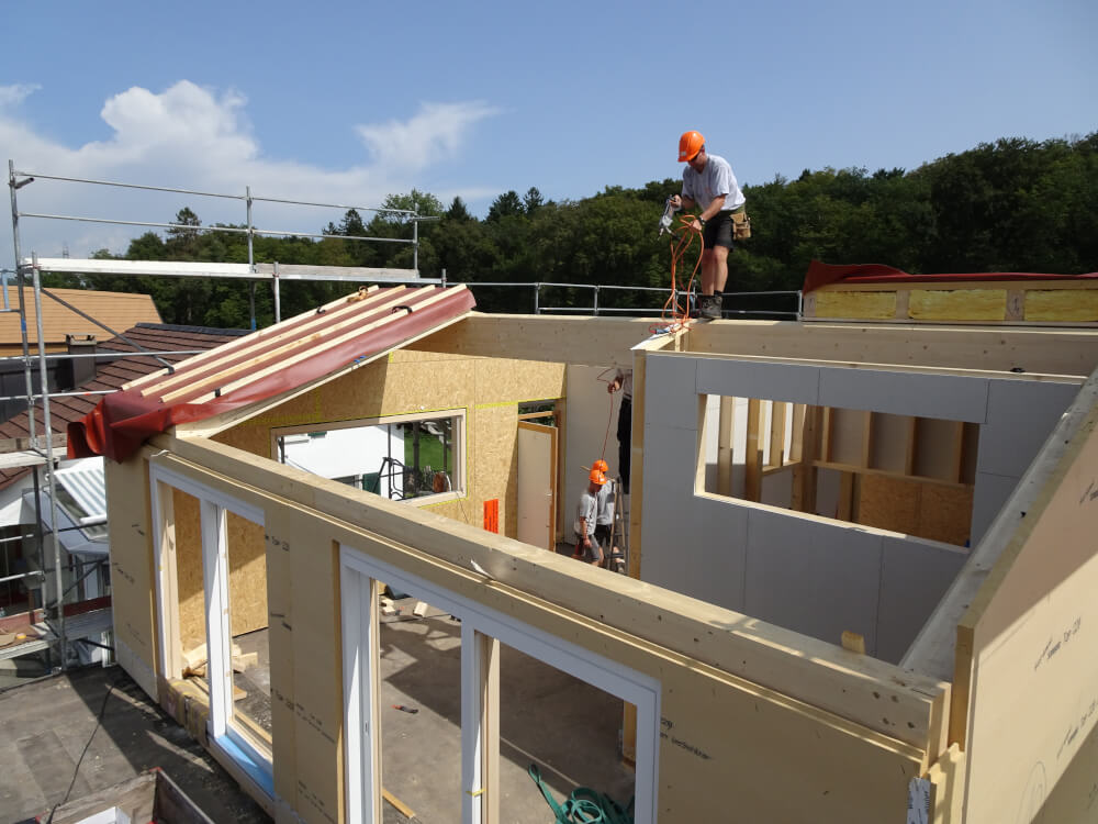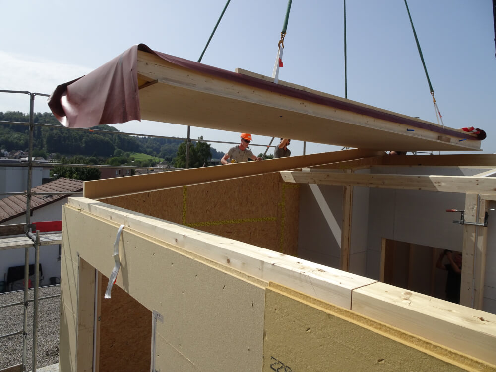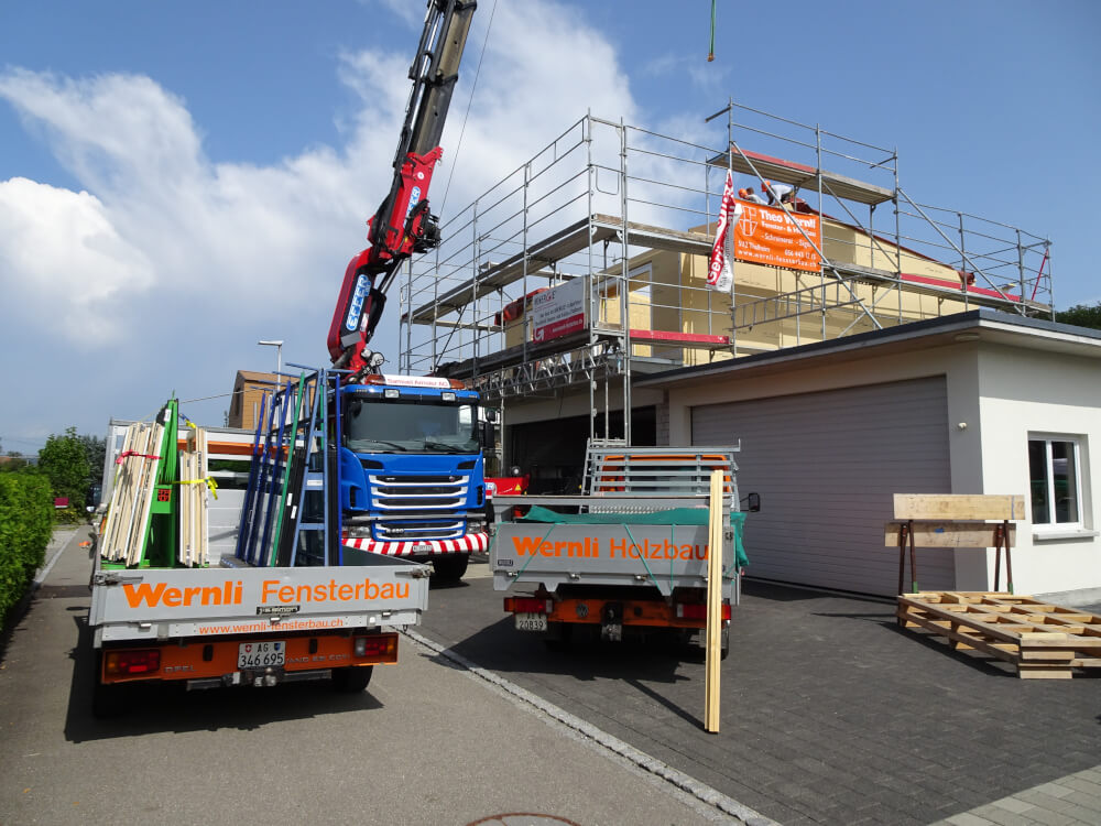 Am Morgen um 7 Uhr war der Kranwagen vor Ort. Um 8 Uhr kamen die Handwerker der Firma Theo Wernli AG, Fenster- & Holzbau. Um 12 Uhr war das erste Dachelement montiert, und am späten Nachmittag ist Aufrichte! Was fehlt, sind die in der Firmenwerkstatt vorgefertigten Fenster und Türen, der Innenausbau samt der Verglasung der Hebeschiebetüren, die Fassade und die Dachdeckerarbeiten. Bis in fünf Wochen ist alles fertig.