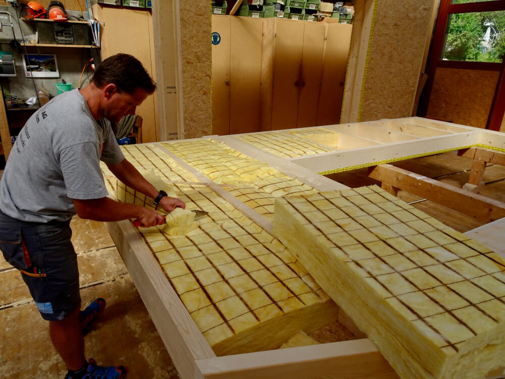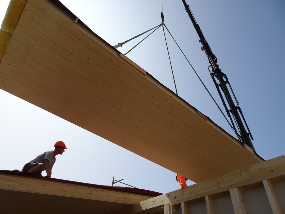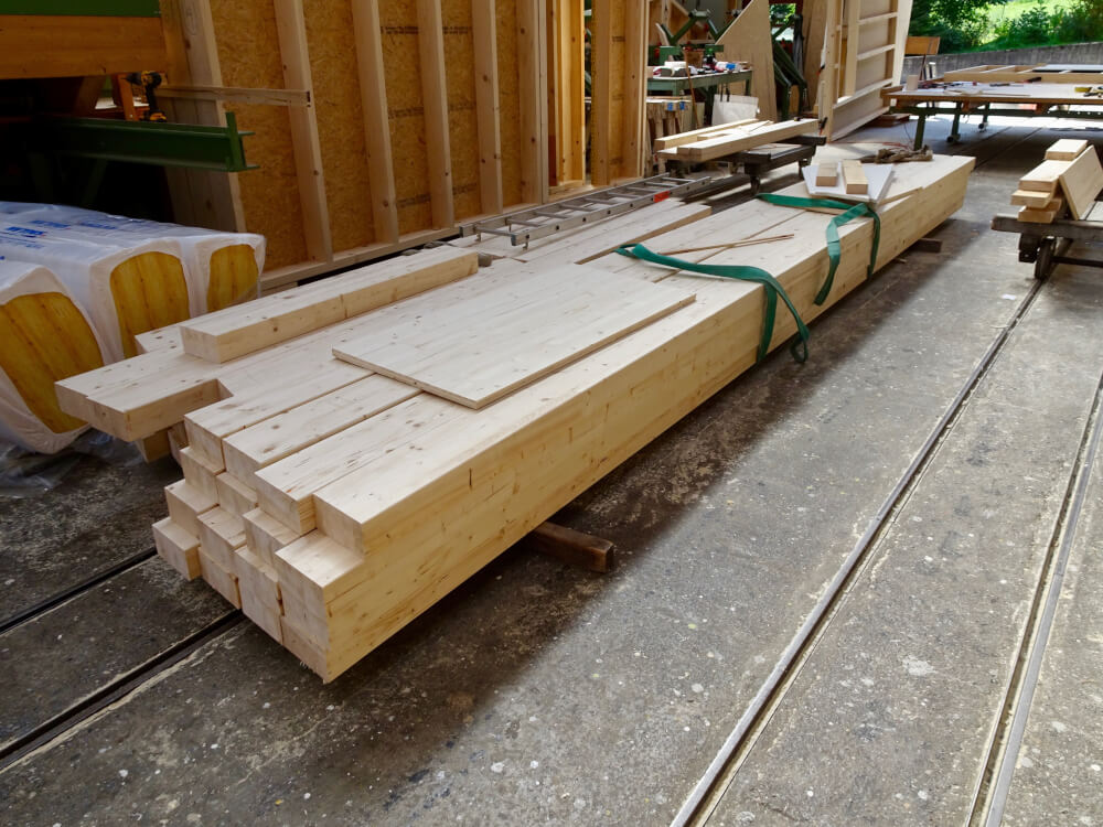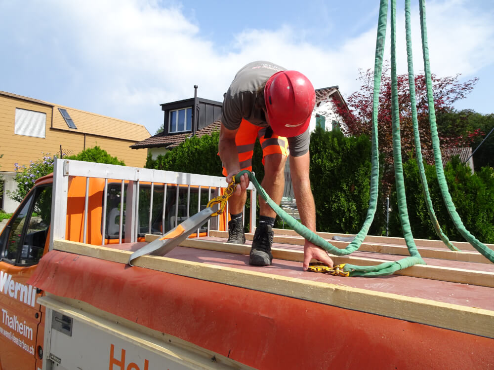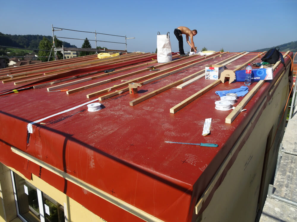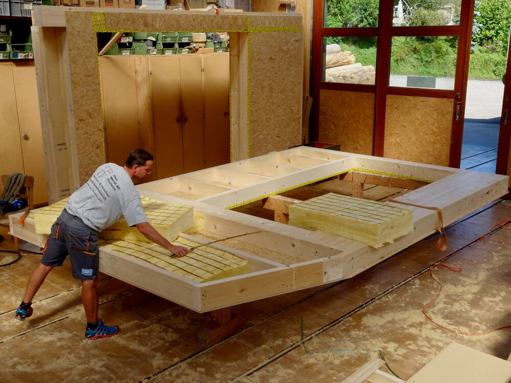 Am Morgen um 7 Uhr war der Kranwagen vor Ort. Um 8 Uhr kamen die Handwerker der Firma Theo Wernli AG, Fenster- & Holzbau. Um 12 Uhr war das erste Dachelement montiert, und am späten Nachmittag ist Aufrichte! Was fehlt, sind die in der Firmenwerkstatt vorgefertigten Fenster und Türen, der Innenausbau samt der Verglasung der Hebeschiebetüren, die Fassade und die Dachdeckerarbeiten. Bis in fünf Wochen ist alles fertig.