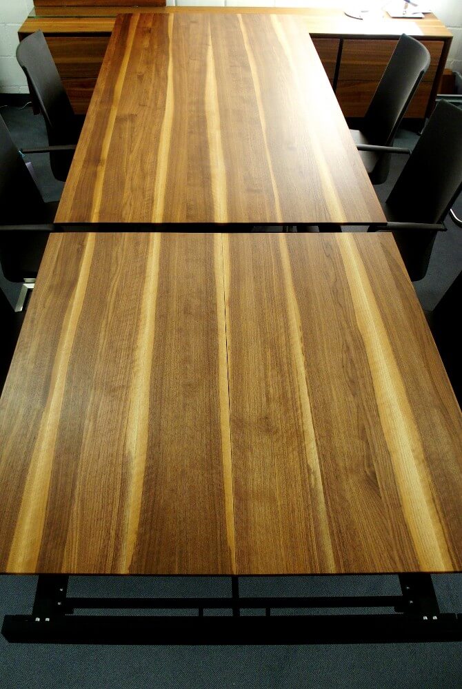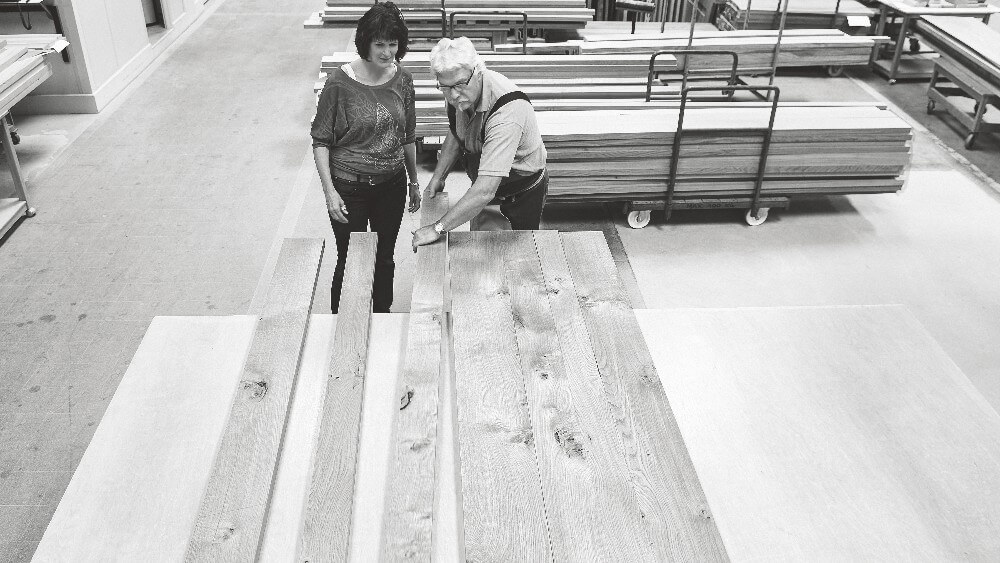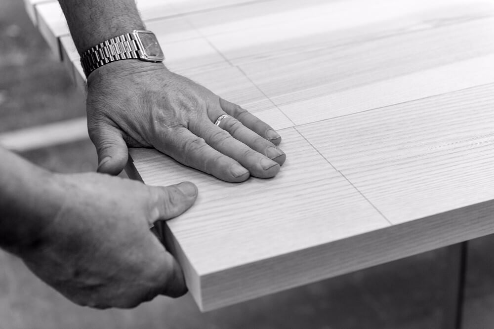 Entsprechend wählen Sie die Holzart, Sie befinden über die Behandlungsmethode des Holzes, Sie begutachten die einzelnen Lamellen (Bretter), und Sie bestimmen die Reihenfolge, in der die Lamellen verleimt werden. Dann erhalten Sie definitiv Ihren persönlichen Tisch, absolut unverwechselbar – und sehr herznah!