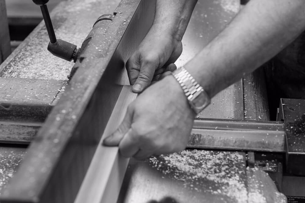 Holz hat immer etwas mit Emotionen zu tun. Verarbeitetes Holz erst recht. Holz erzählt Geschichten: Jahrringe, Asteinschlüsse, Risse. Holz duftet. Der Besuch in der Schreinerei gleicht einem Aufenthalt im SPA-Hotel! Holz muss man berühren, unbedingt. Selbst Rocco Mele, Verkaufsleiter des Geschäftsbereichs Dining beim Möbelhersteller Girsberger, streicht mit der flachen Hand mehrmals über die Holzmuster. Beinahe zärtlich. Als hätte er sie nicht schon hundert Mal von der Wand genommen.