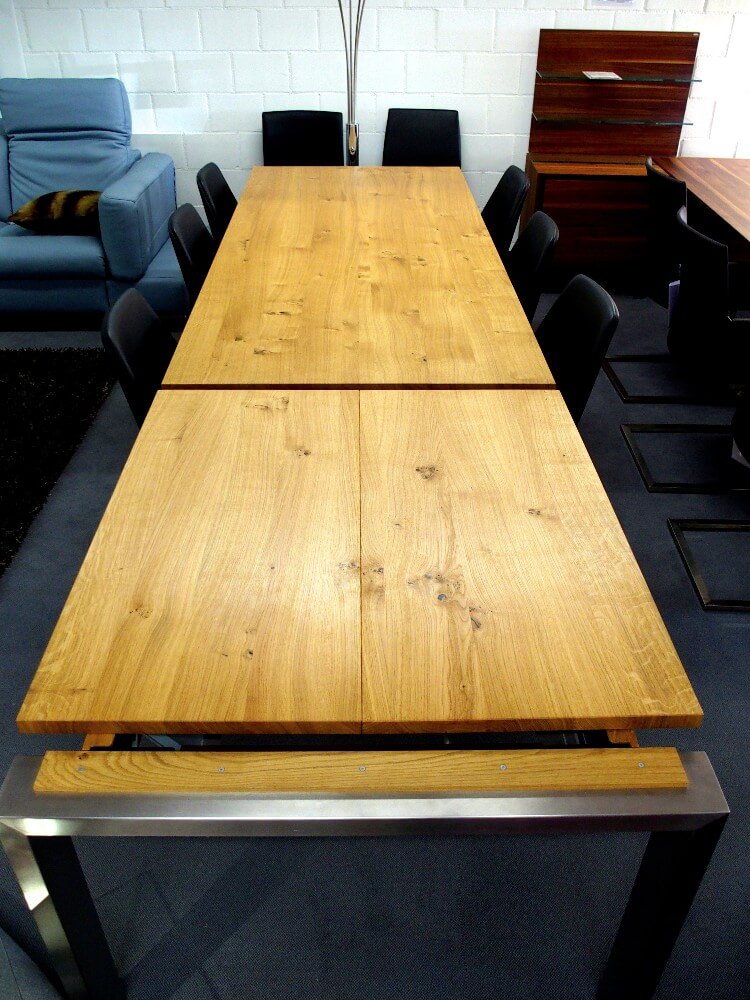 Und wie soll diese gemeinsame Basis nun beschaffen sein? Ein rustikales oder ein elegantes Design? Aus hellem oder dunklem Holz? Ulme, Eiche oder Buche? Helles Holz, etwa von einem Ahorn, wirkt leicht und freundlich. Dem Kirschbaum wird Eleganz, Ruhe und Ausgeglichenheit nachgesagt. Die Platane mutet vornehm, schlicht und edel an. «Und beachten Sie die Verarbeitung», sagt Rocco Mele, «alle Tische haben durchlaufendes Holz; die Maserung zieht sich über die ganze Länge hin. Auch wenn der Tisch ausgezogen ist.» – Tatsächlich, der Kauf eines Tisches will überlegt sein!