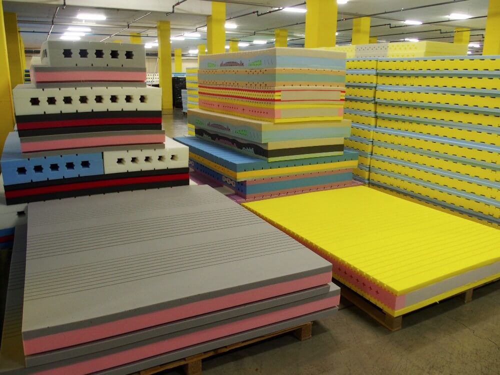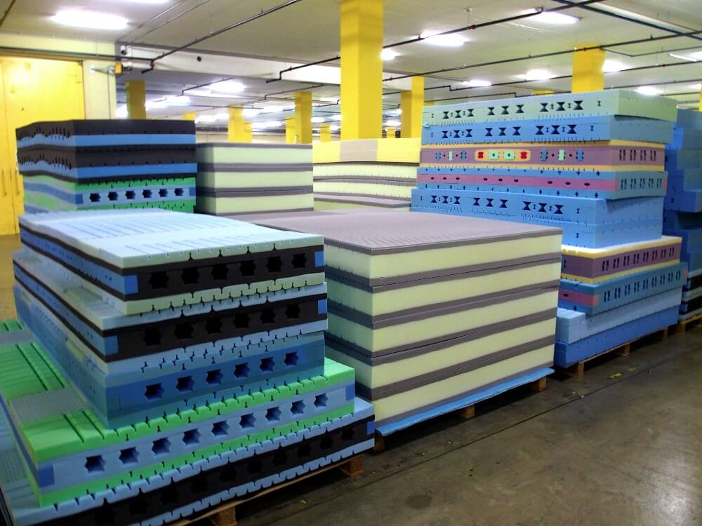 Bunt sieht es aus im Erdgeschoss. Da sind Hunderte von Schaumstoffkernen gestapelt. In unterschiedlichsten Farben und Grössen, einige mit musterähnlichen Aussparungen und regelmässig angeordneten «Löchern», mit Rillen und eingesetzten dämpfenden Federn aus Kunststoff. «Hier haben wir alles auf Lager, vom einfachsten Mono-Kern bis zu aufwändig konzipierten Kernen mit unterschiedlich weichen Schaumstoffen für hohen Liegekomfort und Stützung der Wirbelsäule. Für einen guten Feuchtigkeitsausgleich sorgen die atmungsaktiven und natürlichen Materialien in der Auflage und die speziellen Belüftungskanäle im Kern. Dadurch wird die Flüssigkeit beim Schwitzen in der Nacht abtransportiert.»