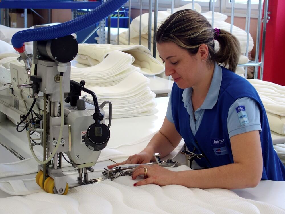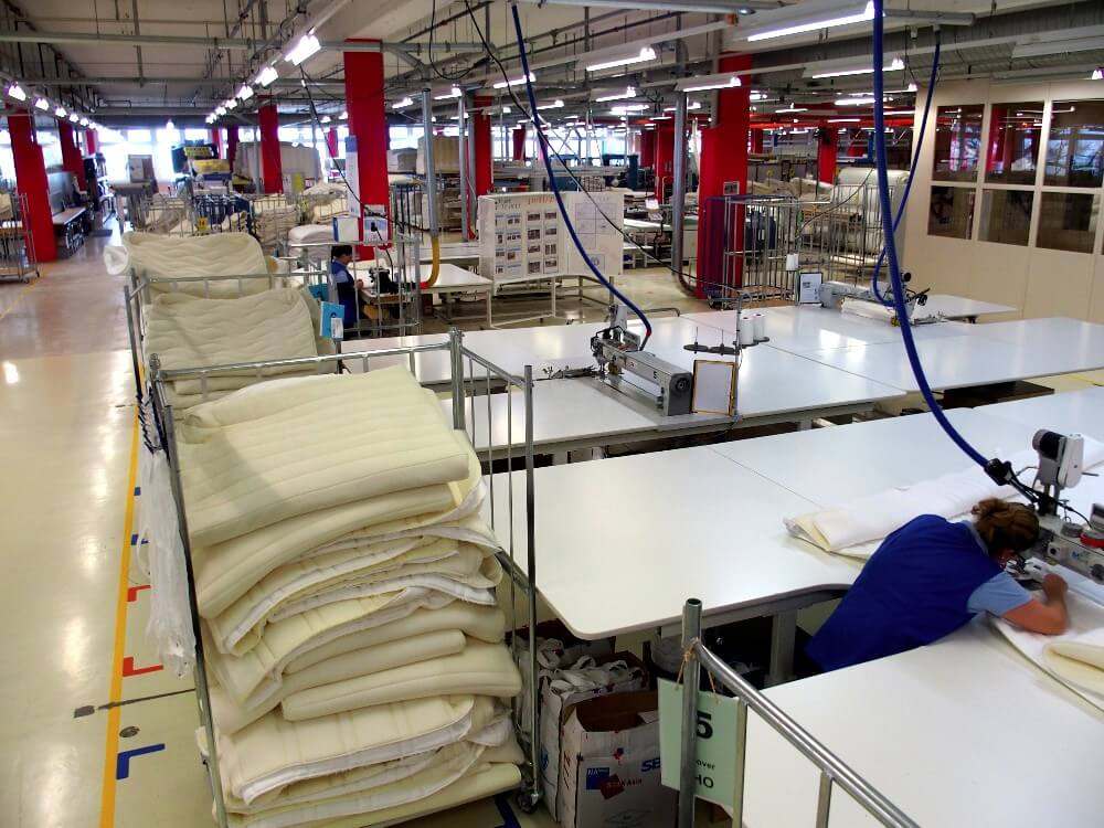Jetzt noch die Seitenbahnen, die sogenannten Border. Falten und Vernähen der Ecken. Die Handgriffe einnähen. Und den Reissverschluss. Pro Jahr werden mehr als 900 Kilometer Reissverschlüsse eingenäht! Etwa 1000 Reissverschlüsse pro Tag! – Fertig ist die Hülle, genau auf diese eine Matratze abgestimmt, die ein Händler in der Schweiz bestellt hat.