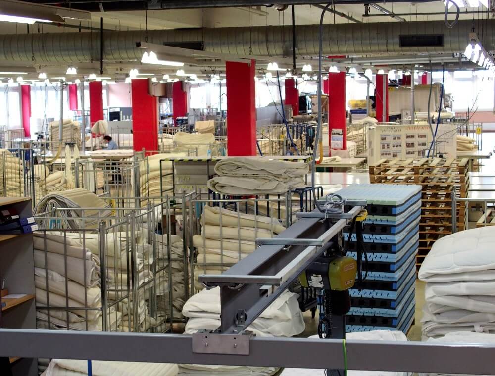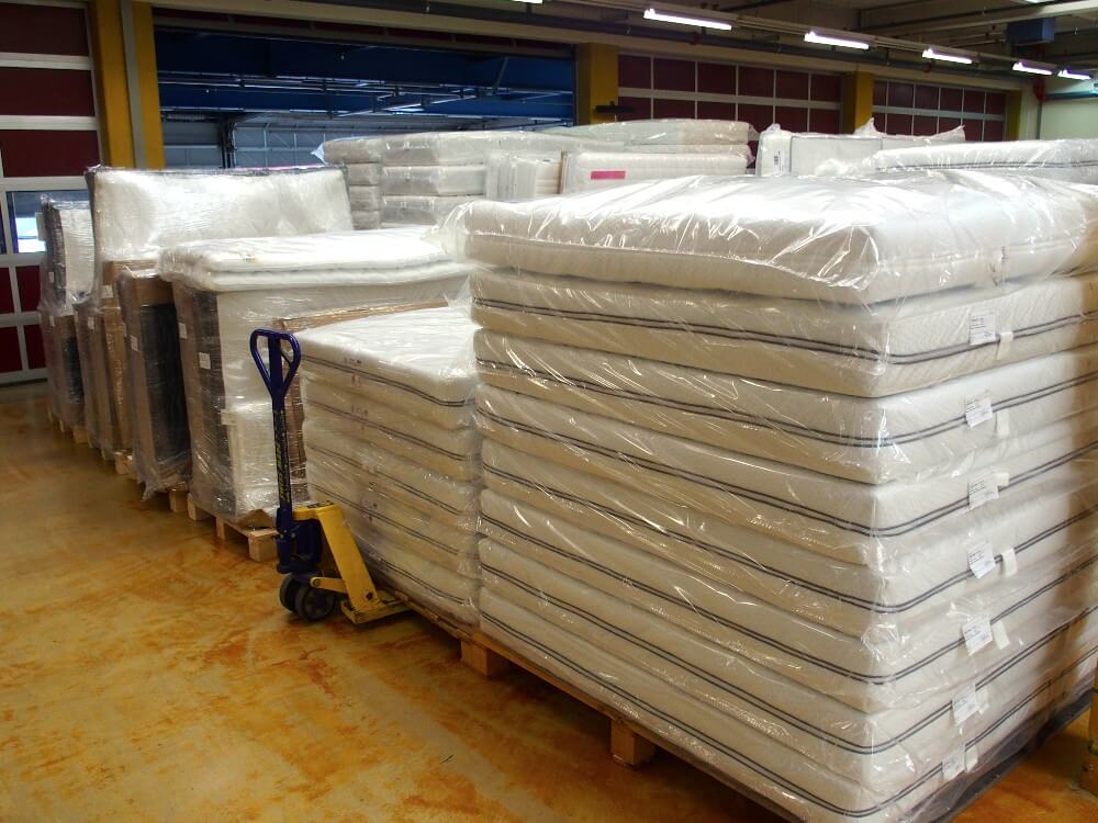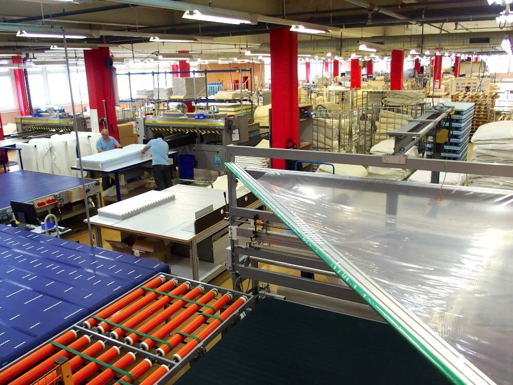 Die fertigen Matratzen kommen auf ein Transportband. Ohne menschliches Zutun bewegen sie sich durch eine Verpackungsanlage. Mit einem kräftigen Schutzplastik eingepackt, sind sie jetzt versandbereit. Die Tageskapazität pro Tag liegt bei 400 Matratzen. Sechs grosse Lastwagen bringen sie auf definierten Routen zu den Händlern in der ganzen Schweiz.