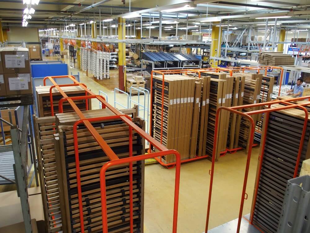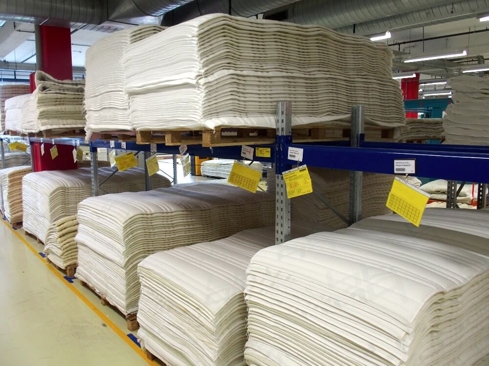 Es gibt Stapel mit unterschiedlichen Matratzenkernen. Bei jedem „Los“ handelt es sich um die Bestellungen eines Bico-Händlers. «Wir produzieren die Matratzen nicht auf Vorrat, sondern immer erst auf Bestellung. Dabei garantieren wir eine Lieferfrist von fünf Tagen. Fünf Tage nach dem Eingang der Bestellung ist die fertige Matratze beim Händler.»