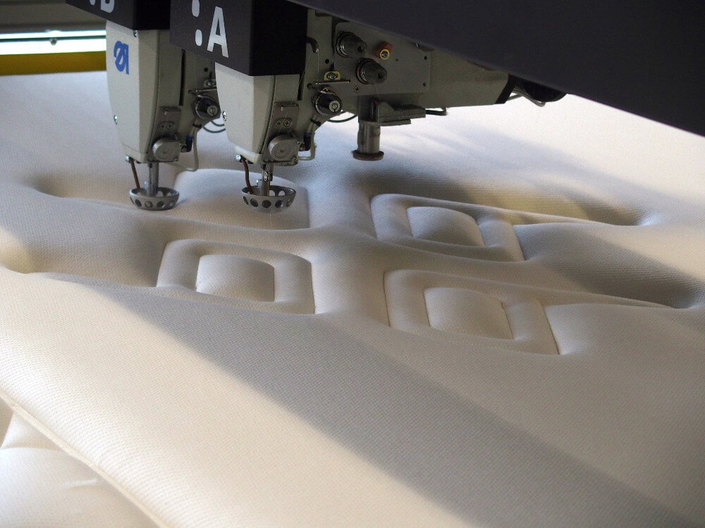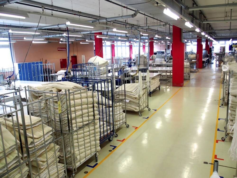 Ein Stockwerk höher befindet sich die Produktion der Matratzenhüllen. Drei Steppmaschinen bearbeiten die Vliesrollen. 60 verschiedene Stoffe, 17 unterschiedliche Wollauflagen, darunter Schafwolle und Kamelhaar, 20 Steppmuster-Varianten – die drei Anlagen schaffen pro Tag bis zu 1500 Laufmeter! Daraus entstehen die sogenannten «Platten», also die Unter- und die Oberseite der Matratzenhülle.