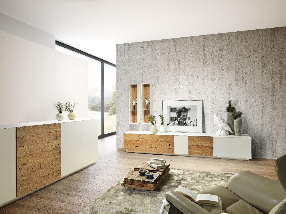 Modernes Möbeldesign mit dekorativ eingesetzten Altholzelementen