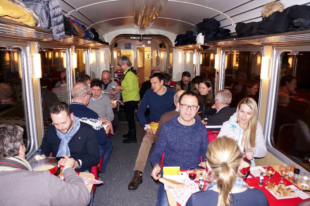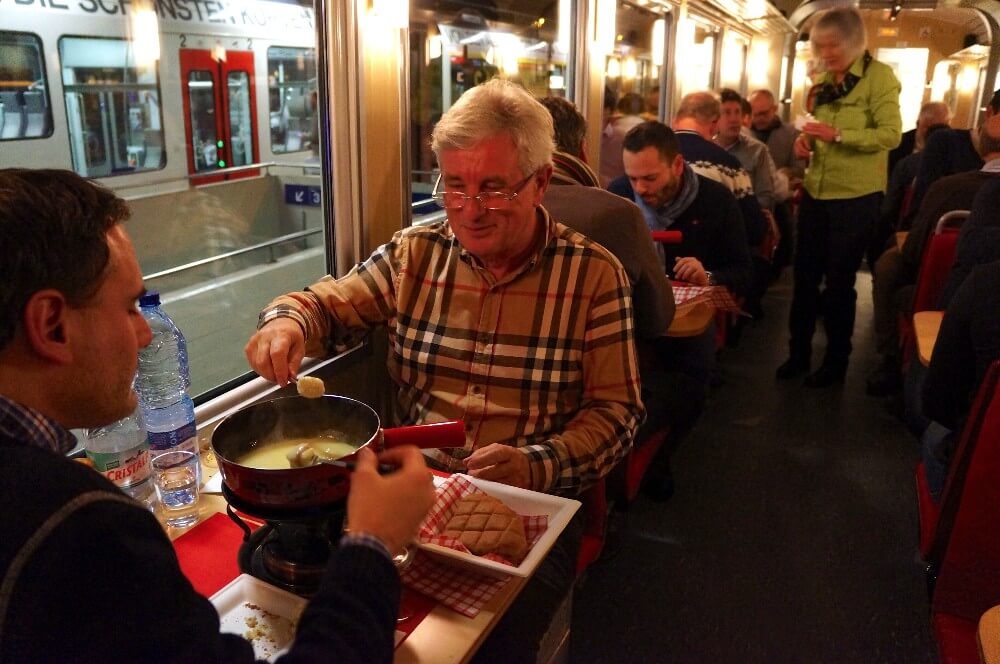 Los ging die Fahrt. In gemütlichem Tempo über den Mutschellen in Richtung Dietikon. Unterwegs als Gaumenkitzel schon mal ein Tessiner Plättli. Im Bahnhof Dietikon blieb der Zug so lange stehen, bis jedes Tischchen mit einem Fondue-Set ausgestattet war: Rechaud, Caquelon, Fonduegabeln, Käsemischung, Kirsch, Knoblauch. Den Spass bei der Zubereitung kann man sich ohne weiteres vorstellen: Italiener, Holländer, Belgier und Franzosen im Fondue-Fieber! Na prosit!